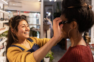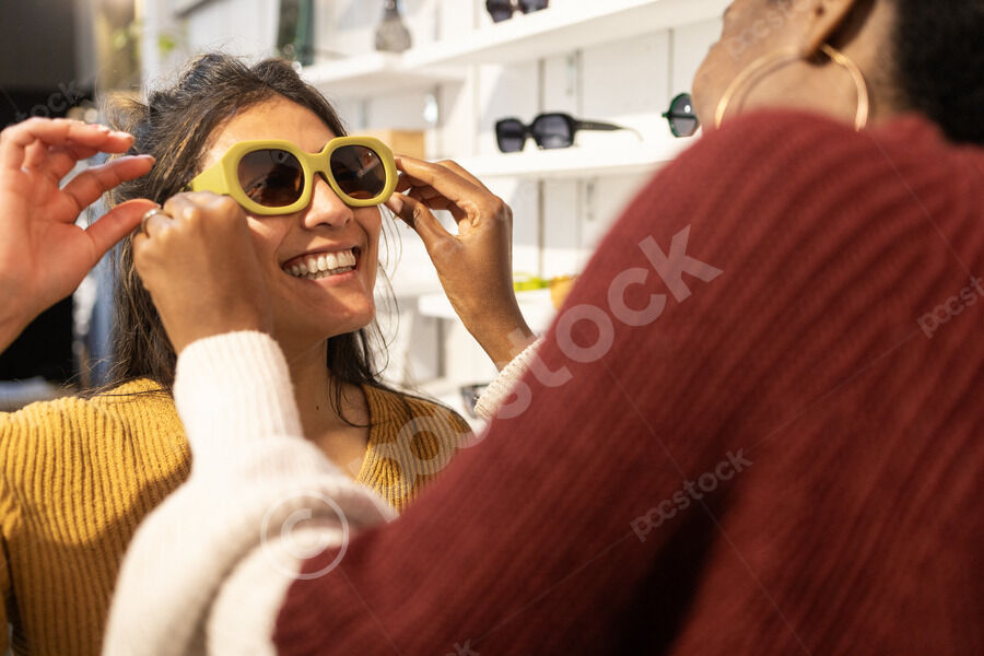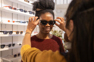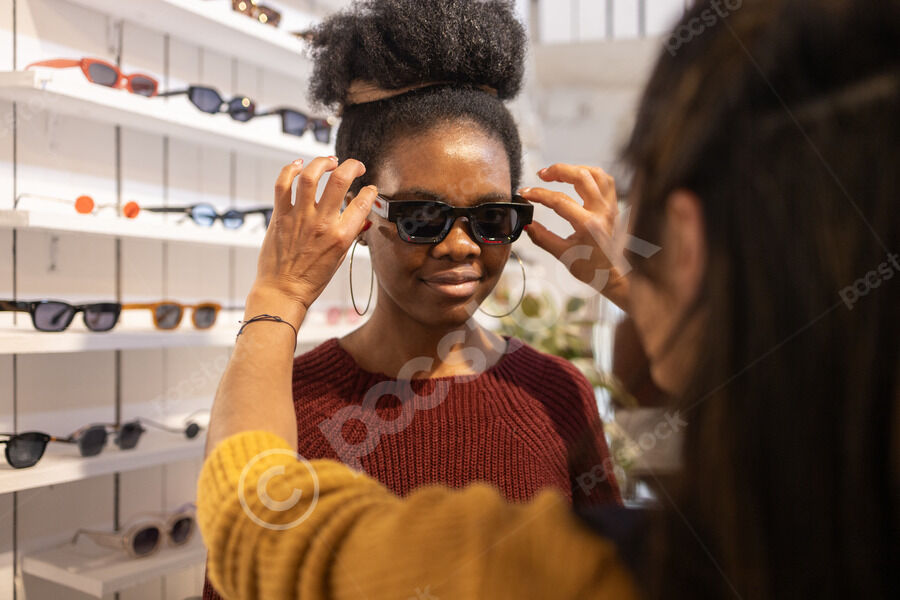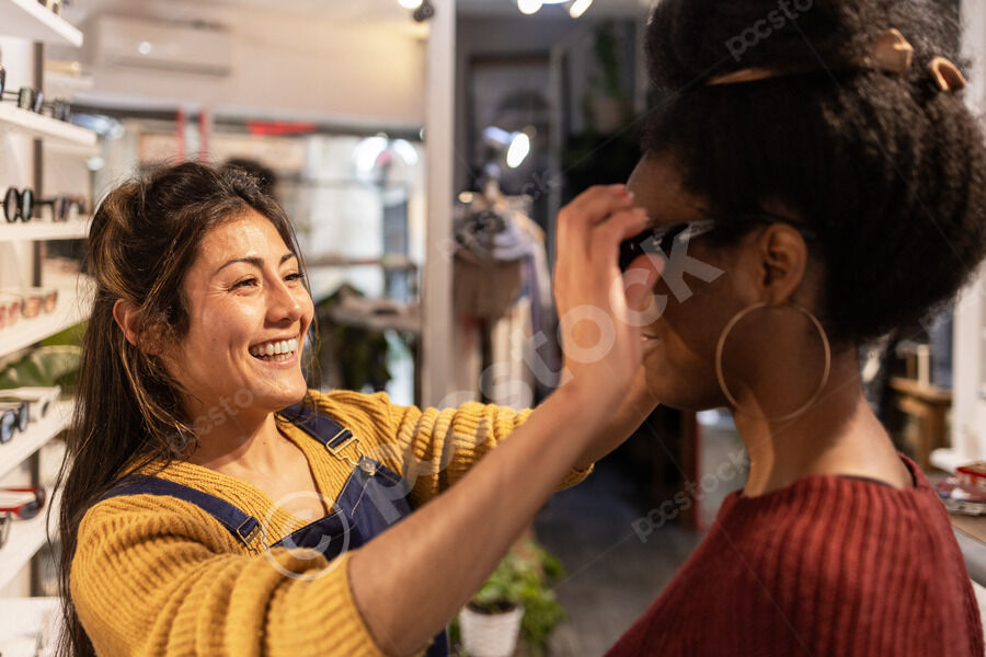Hispanic female employee assisting Black female customer in choosing sunglasses in an eyewear boutique