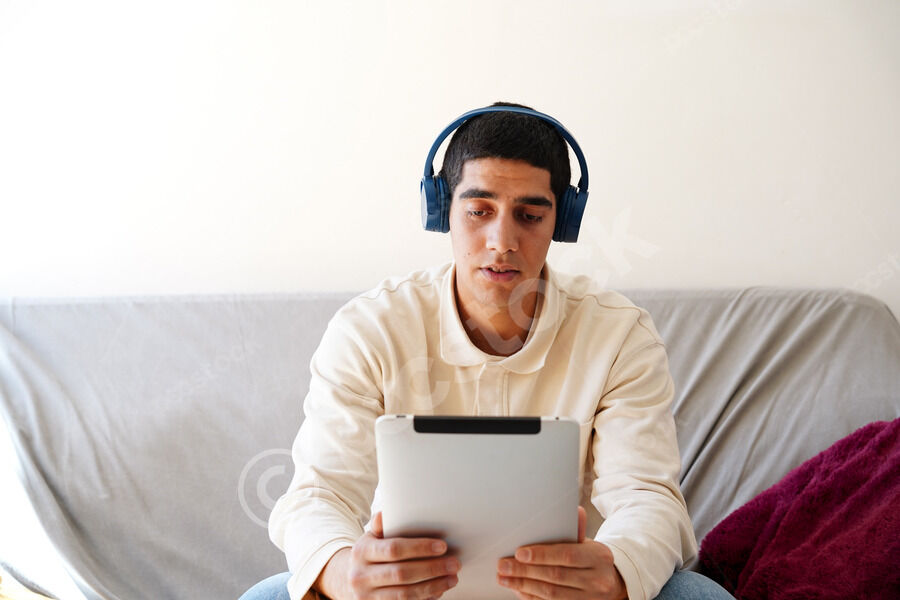 Middle Eastern man wearing blue headphones using tablet while sitting on sofa in living room at home
