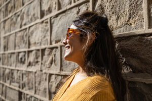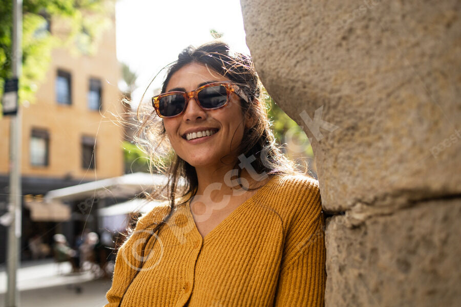 Hispanic woman in mustard sweater and sunglasses looking away smiling while standing and leaning against textured wall outdoors