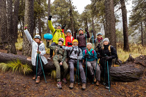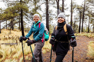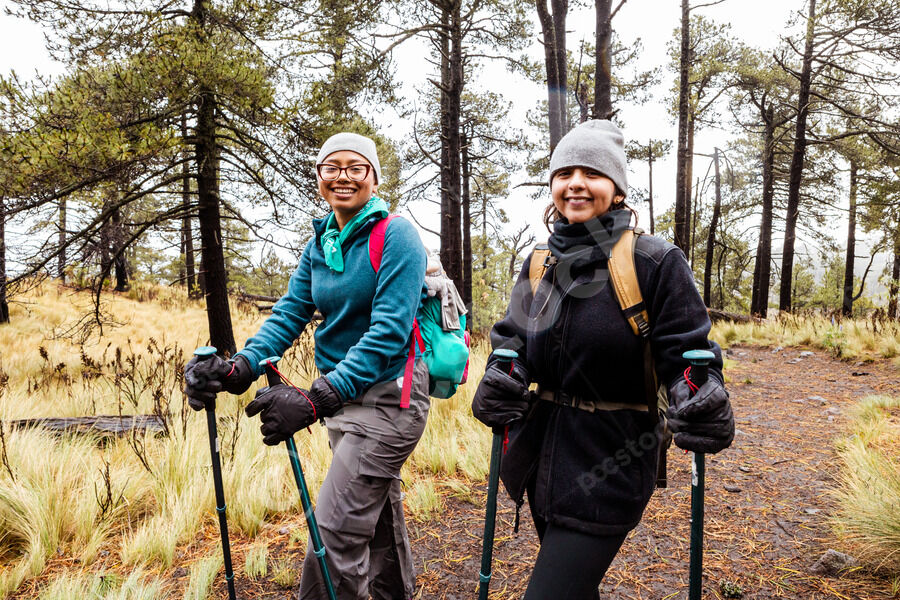 Hispanic female hikers walking on wet trail in misty forest landscape during daytime