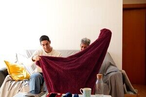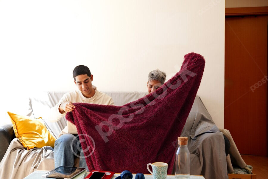 Middle Eastern man and caucasian woman folding holding fleece blanket together while sitting on sofa in living room at home