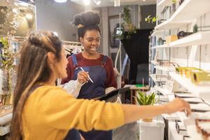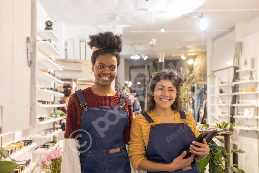 Black and Hispanic female employees wearing aprons smiling standing with tablet in an eyewear boutique