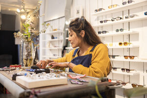 Hispanic female store assistant wearing yellow sweater and apron standing and organizing accessories in an eyewear boutique