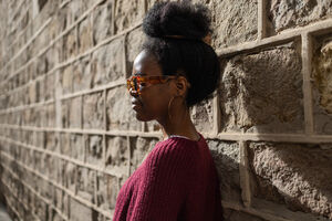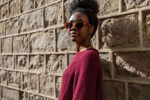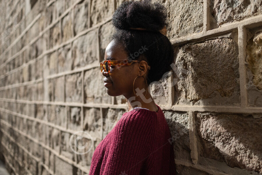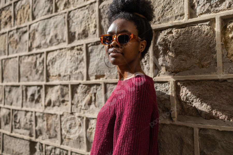 Black woman in maroon sweater and sunglasses looking away standing and leaning against textured stone wall outdoors