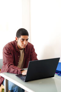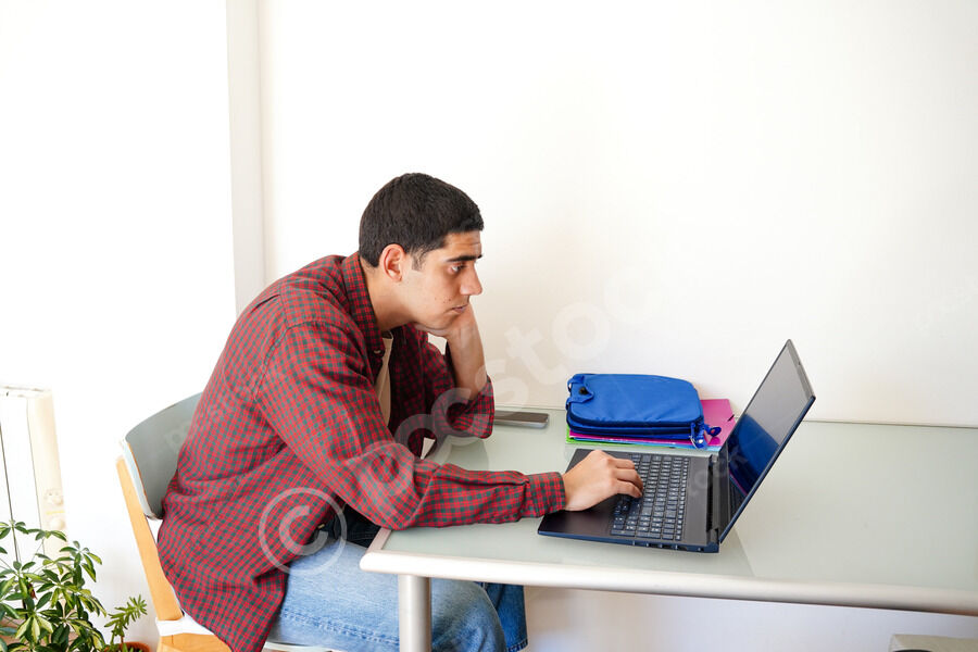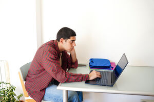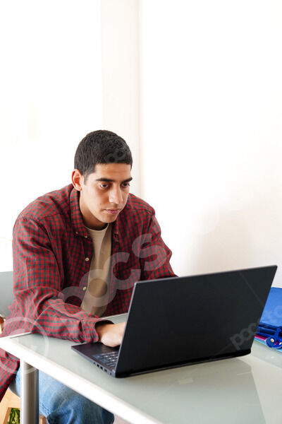 Middle Eastern man in red plaid shirt sitting at table and using laptop at home