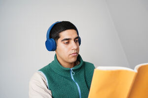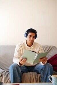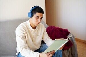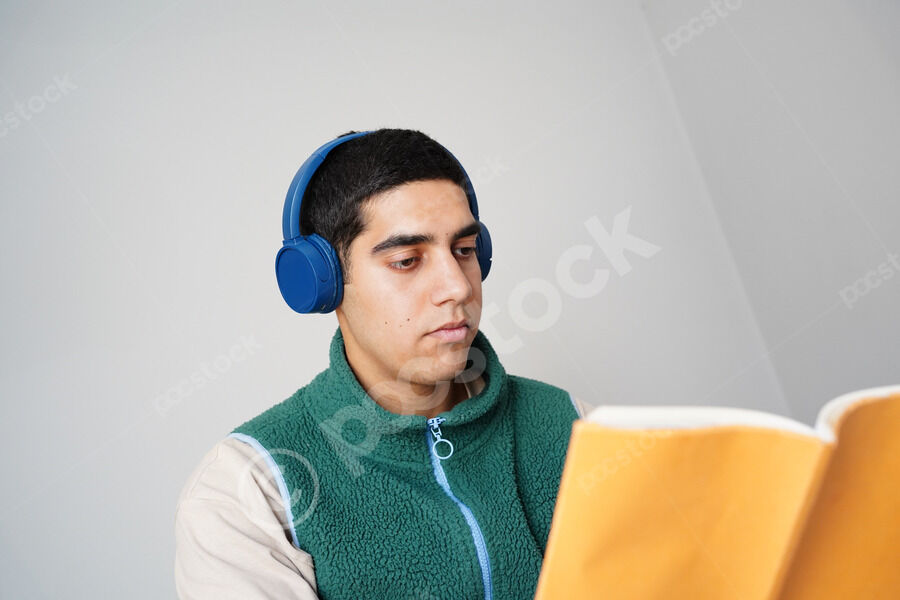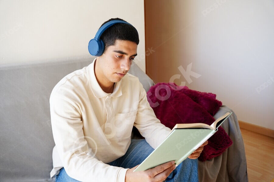 Middle Eastern man wearing blue headphones reading book while sitting on sofa in living room at home