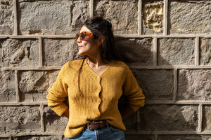 Hispanic woman in mustard sweater and sunglasses looking sideways standing and leaning against textured wall outdoors
