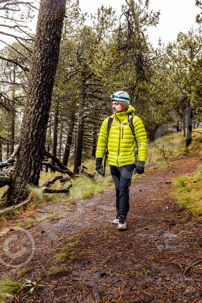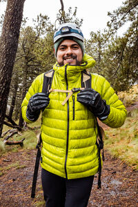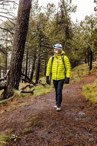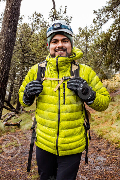 Hispanic male hiker wearing green jacket standing on trail in forest on winter day