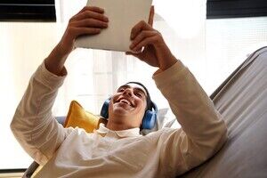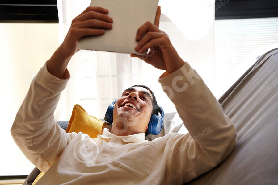 Middle Eastern man wearing blue headphones using tablet while lying on sofa in living room at home