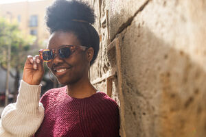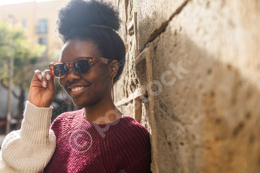 Black woman in red and white sweater touching her eyeglasses and smiling while standing and leaning against textured stone wall outdoors on sunny day