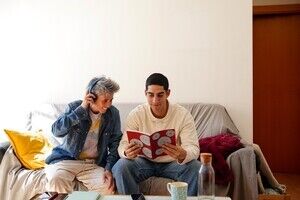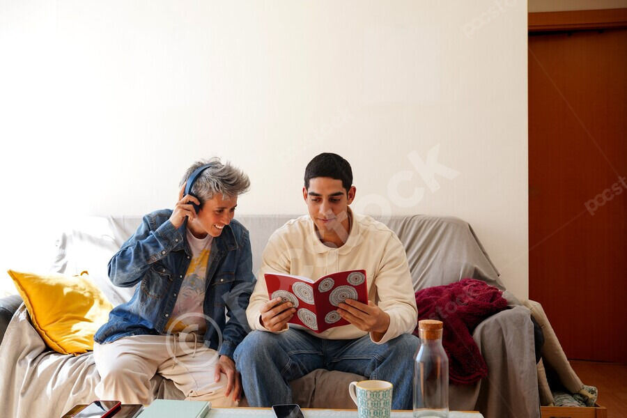 Middle Eastern man holding and reading red book while sitting on sofa with caucasian woman wearing headphones in living room at home