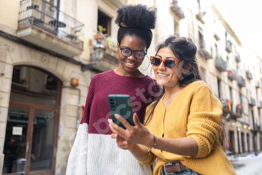 Black and Hispanic female friends wearing sunglasses and eyeglasses sharing smartphone while walking on street during daytime
