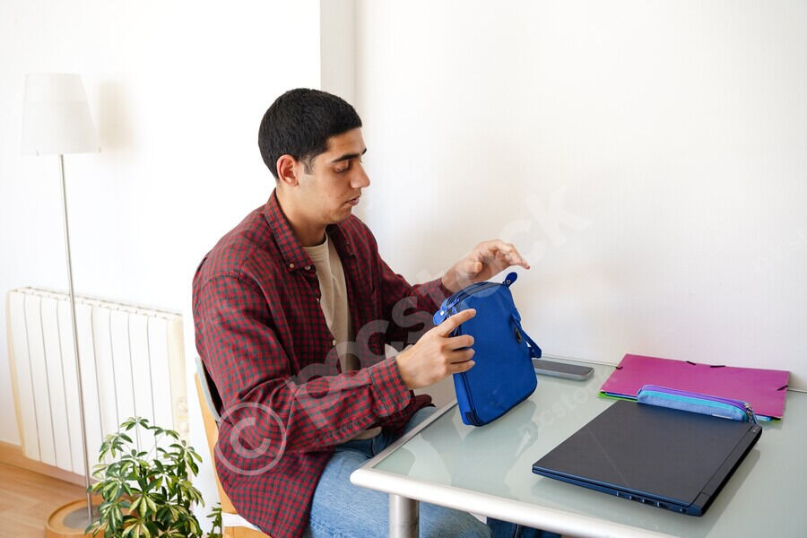 Middle Eastern man in red plaid shirt opening his blue bag while sitting at table with laptop and folders at home
