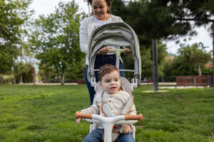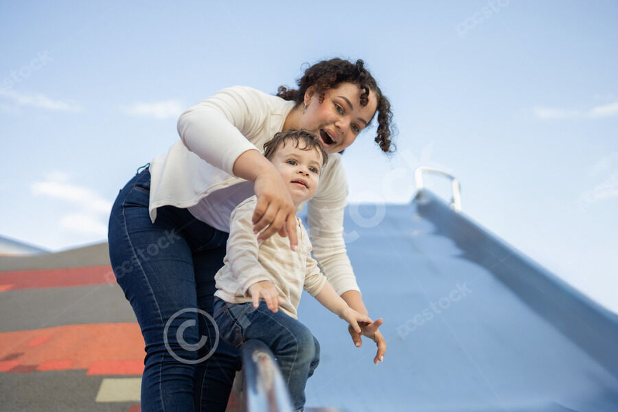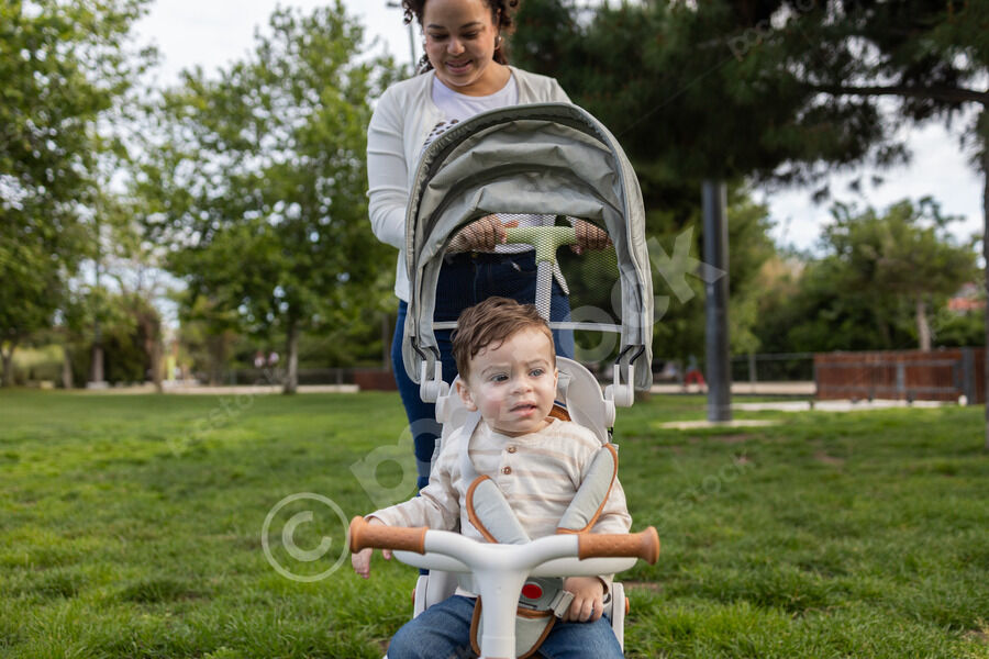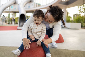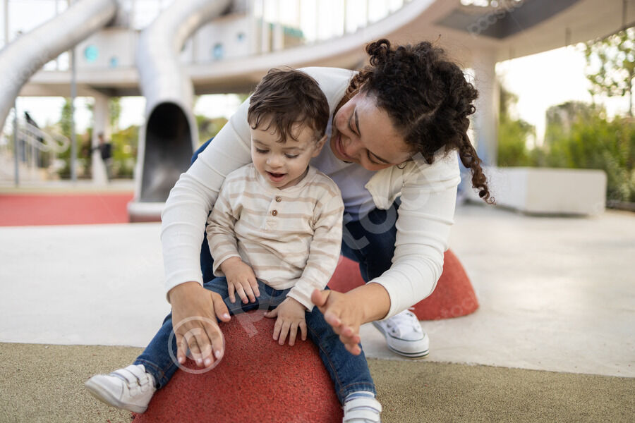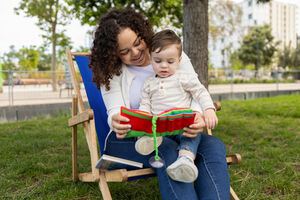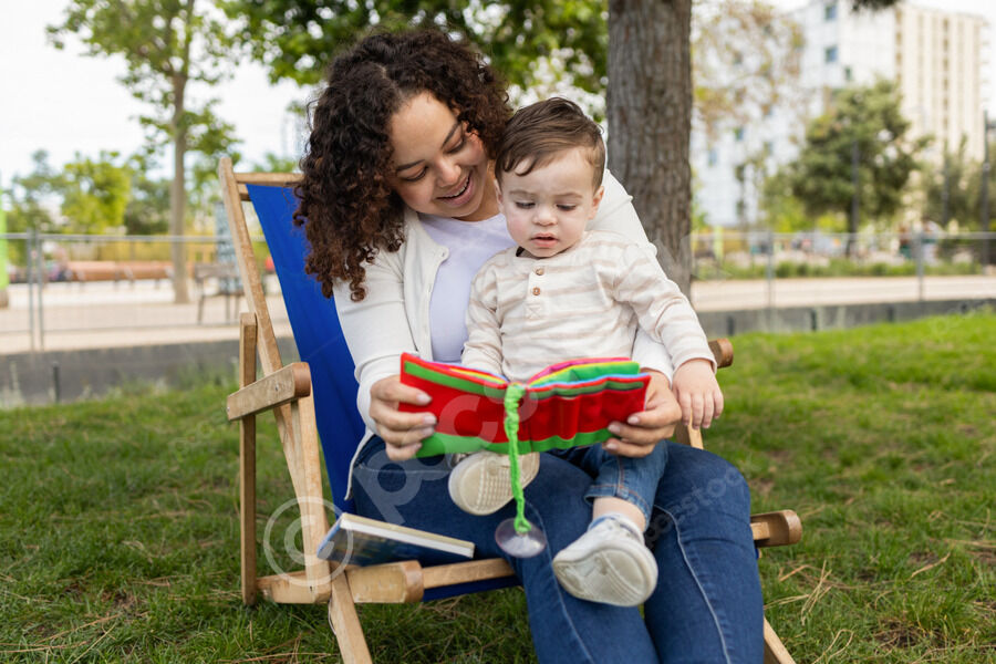 Hispanic woman with mixed race baby boy on her lap reading book while sitting on chair at park