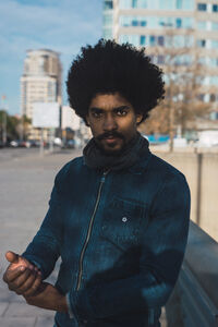 Black man with afro looking away while standing in front of railing in city during sunny day