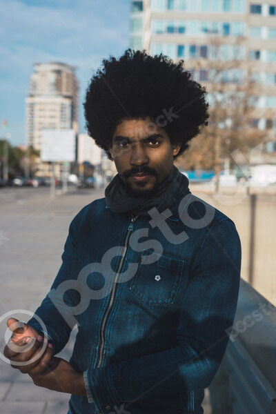 Black man with afro adjusting his jacket while standing in city during sunny day