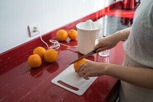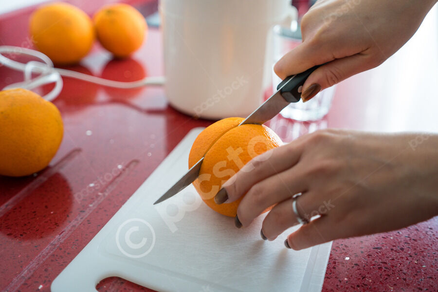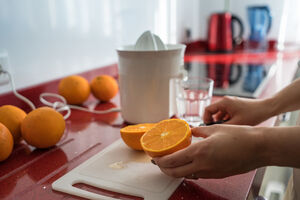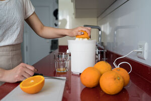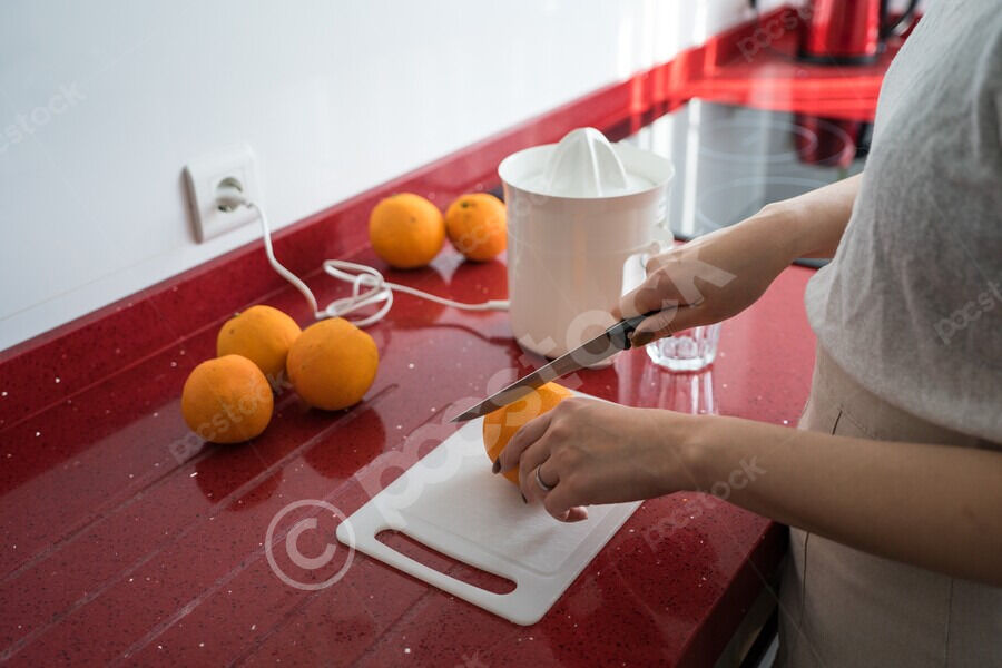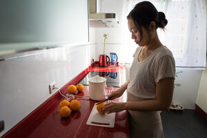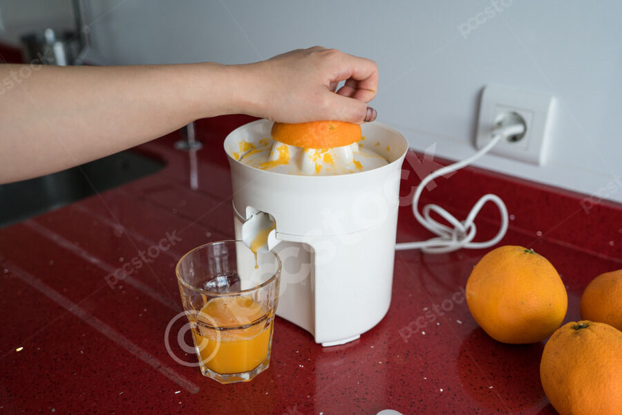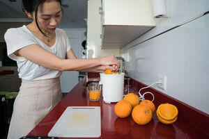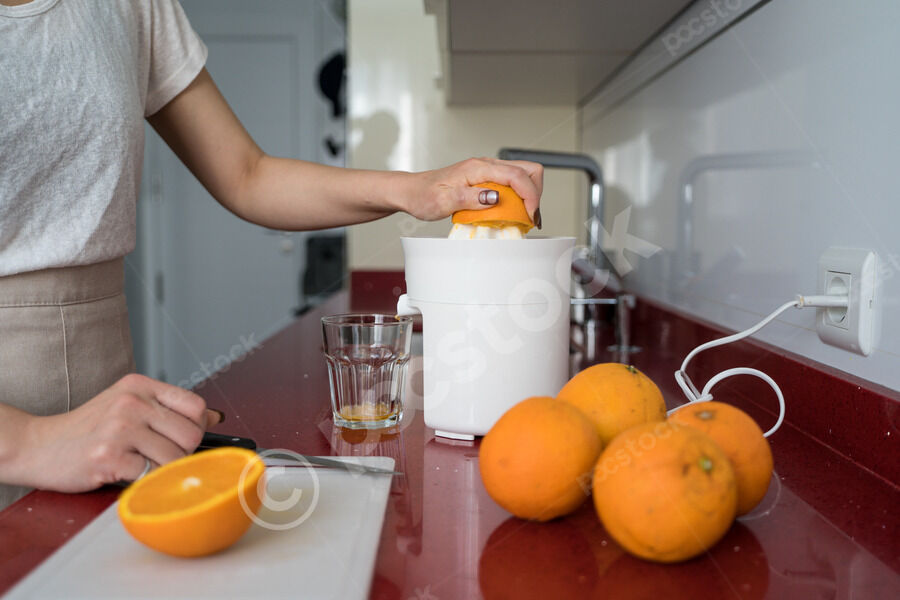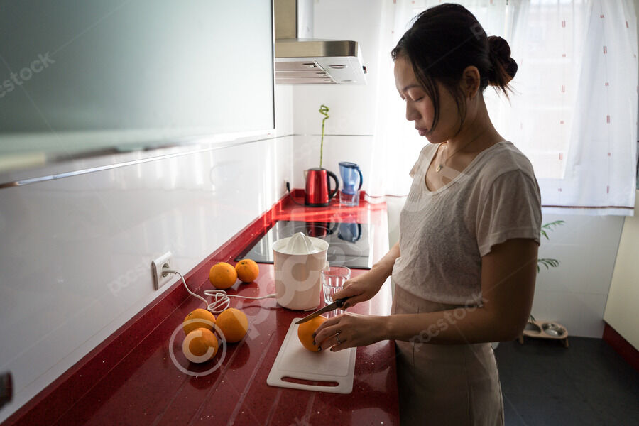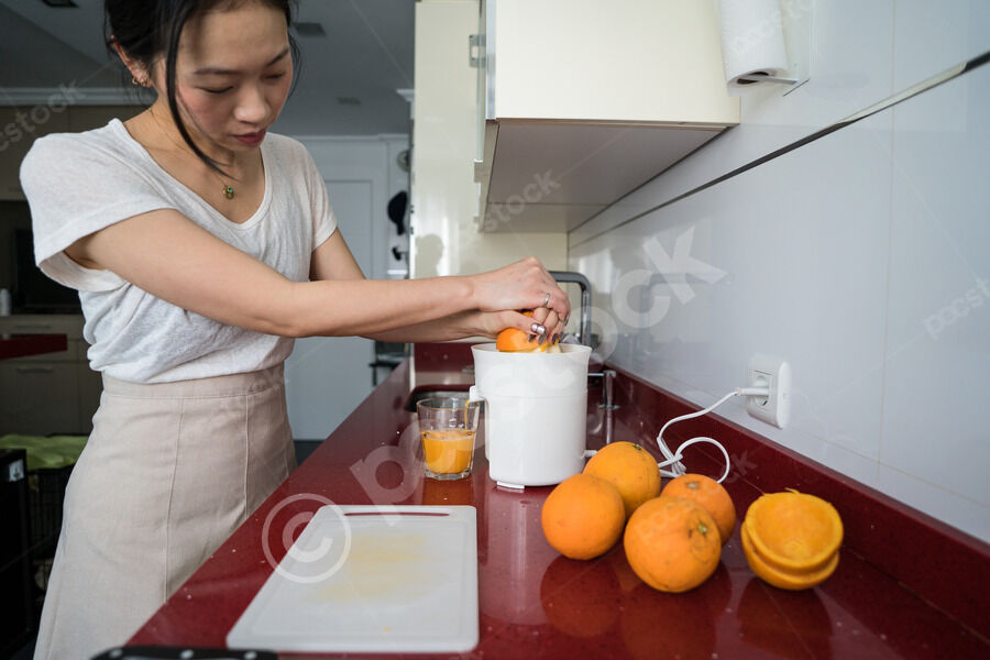 Chinese woman making fresh orange juice while standing at kitchen counter at home