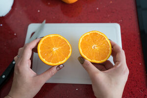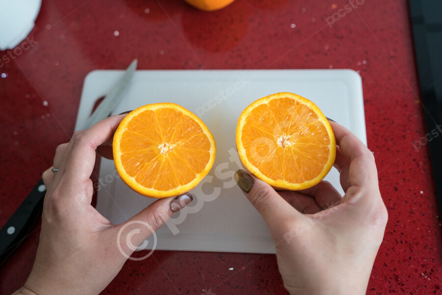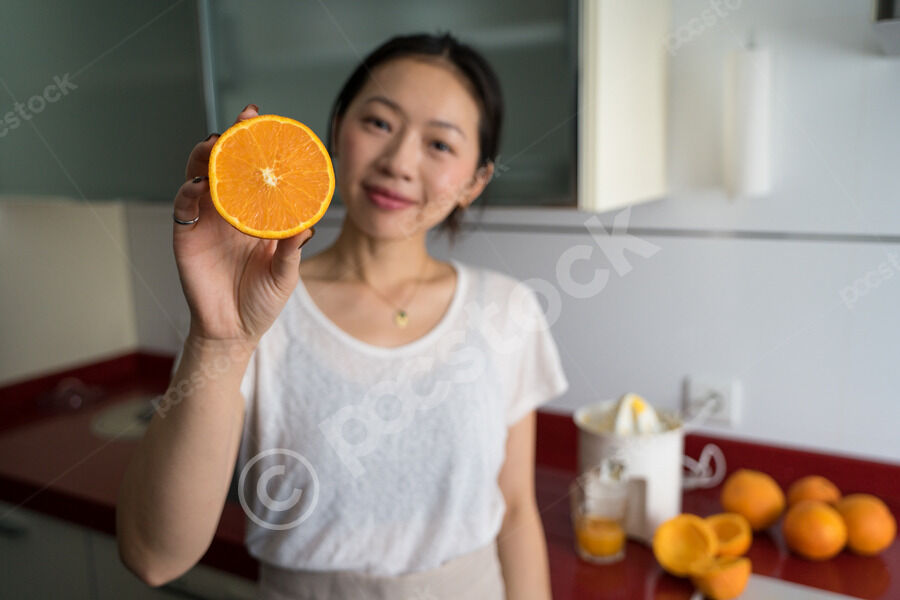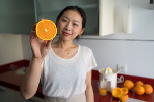 Chinese woman holding and showing orange half while standing in kitchen at home