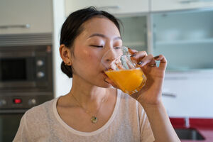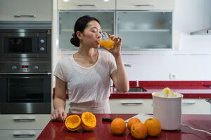 Chinese woman drinking orange juice from glass while standing in kitchen at home