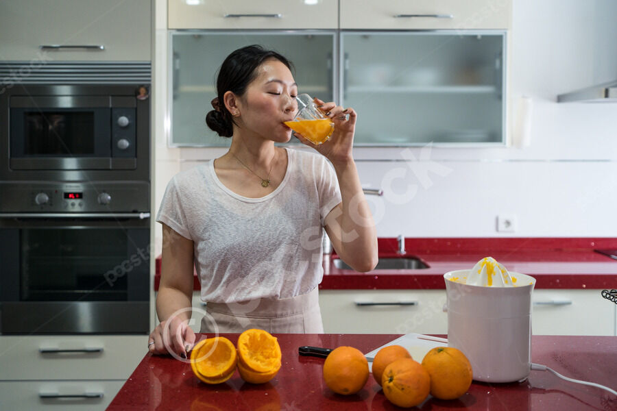 Chinese woman drinking orange juice from glass while standing at kitchen counter at home