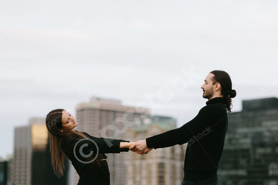 Side view of Middle Eastern male and caucasian female couple dancing on city rooftop during daytime