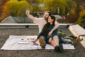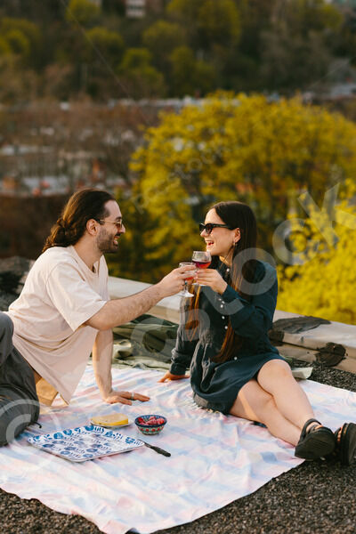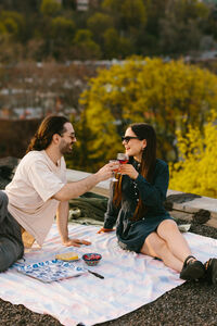 Middle Eastern male and caucasian girlfriend toasting glasses of wine during picnic on rooftop at sunset