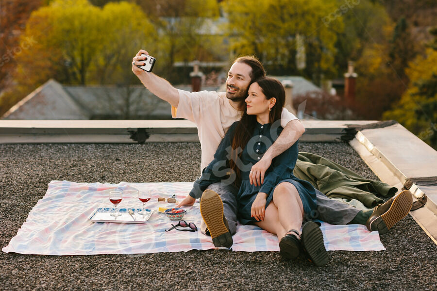 Middle Eastern man embracing caucasian girlfriend from behind while taking selfie sitting on rooftop at sunset