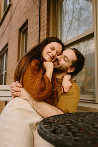 Middle Eastern male and caucasian female couple hugging each other in balcony at sunset