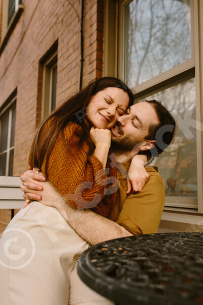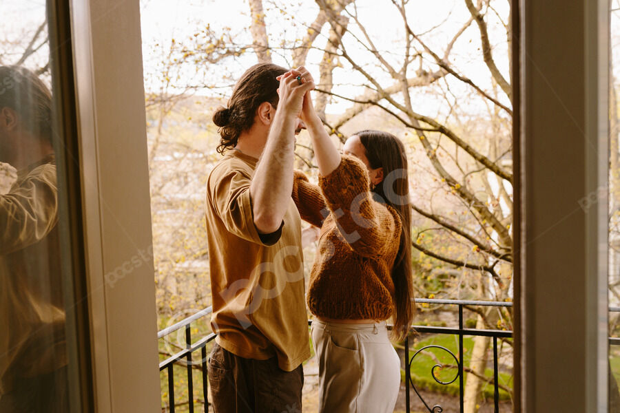Middle Eastern male and caucasian female couple dancing on balcony with autumn trees in background
