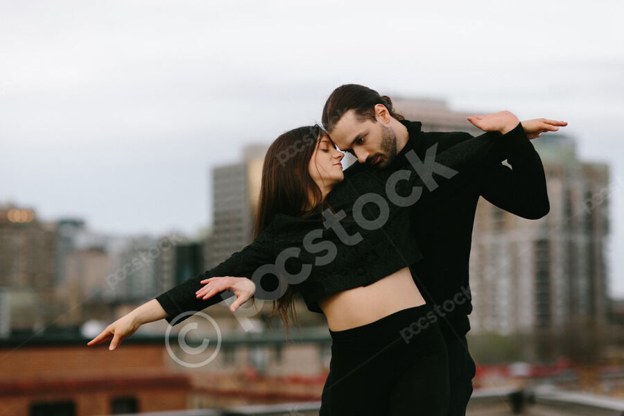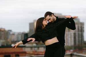 Middle Eastern male and caucasian female dancing on city rooftop during twilight