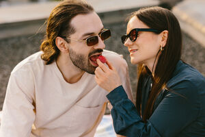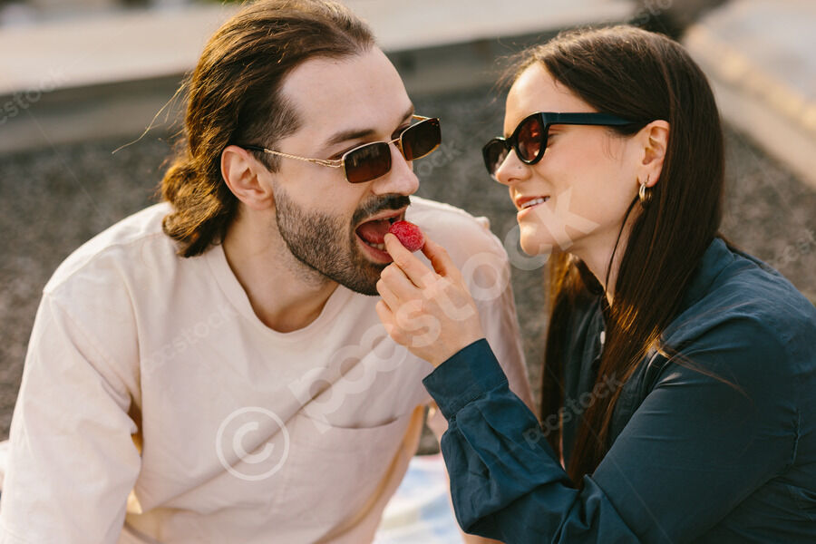 Middle Eastern man eating strawberry with caucasian girlfriend feeding him during picnic on rooftop at sunset