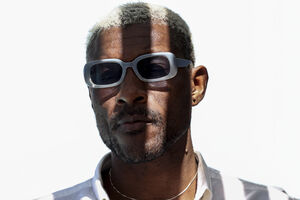 Hispanic man wearing white sunglasses standing against white wall under bright sunlight with pergola shadow stripes