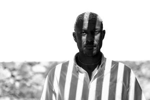 Hispanic man wearing white shirt with shadows of pergola stripes standing outdoors on sunny day
