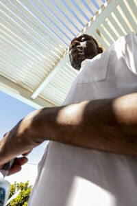 Low angle view of Hispanic man looking downwards standing under white pergola with striped shadows on sunny day