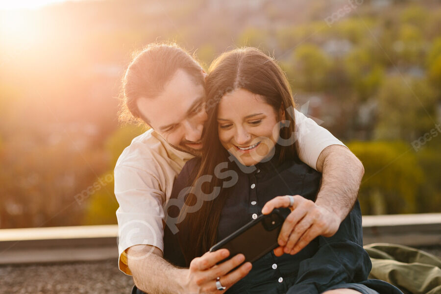 Middle Eastern man embracing caucasian girlfriend from behind while showing smartphone sitting on rooftop at sunset