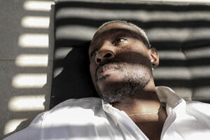 Hispanic man looking away lying on floor with sunlight and shadow stripes of pergola