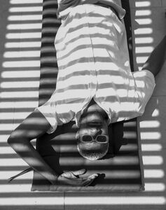 Top view of Hispanic man lying on floor with sunlight and shadow stripes of pergola