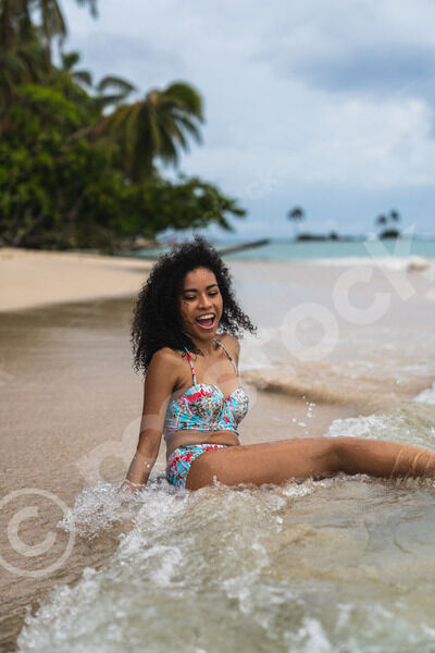 Smiling Hispanic woman sitting in water near coconut trees in beach during summer