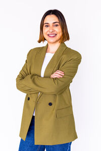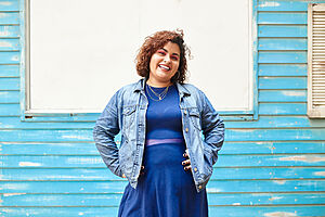 Plus sized Mexican woman with curly hair standing hands on waist smiling