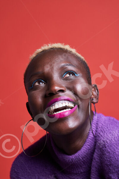 Black curvy woman looking above shoulder standing against colorful background indoors