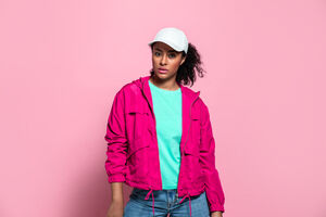 Black female touching sunglasses while standing in neon lights in studio