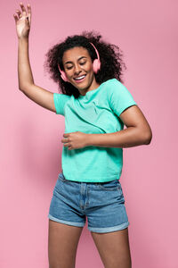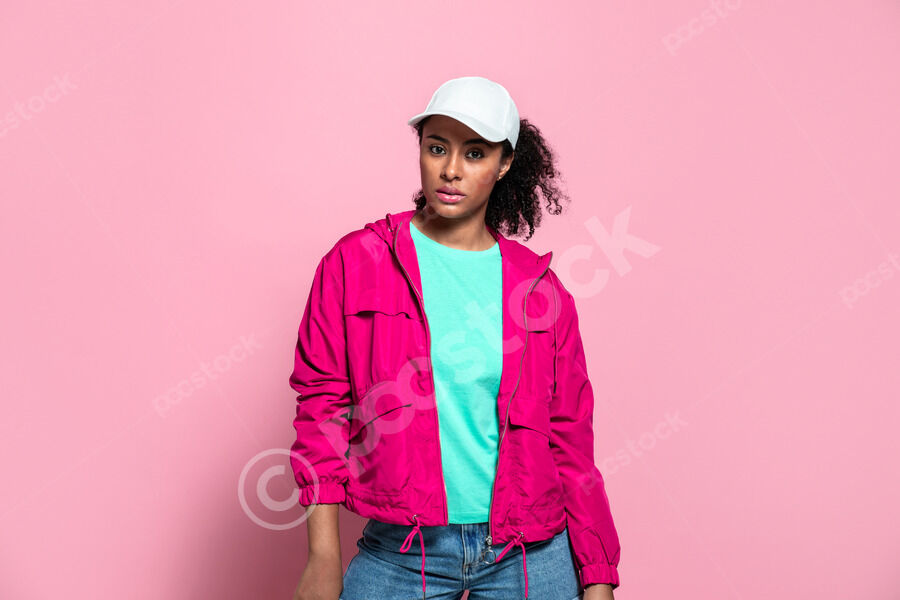 Black female touching face while standing against neon lights in studio