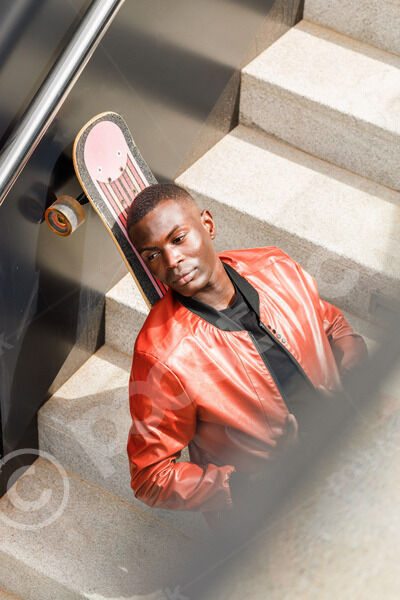 Serious African American man in red leather jacket looking away leaning on skateboard while sitting on stairs on sunny day