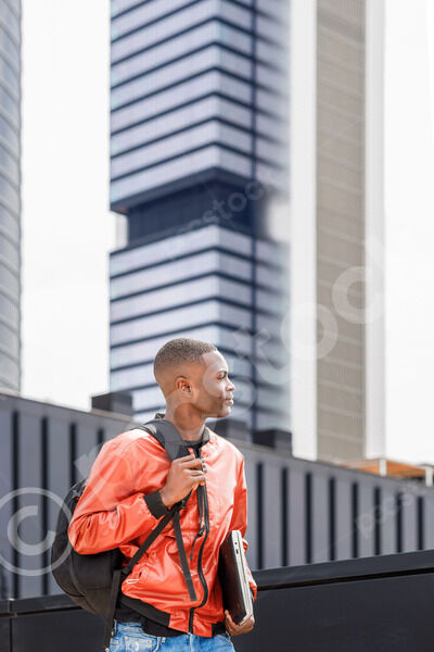 Serious African American man looking away walking with backpack and laptop on city street during daytime