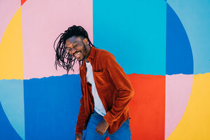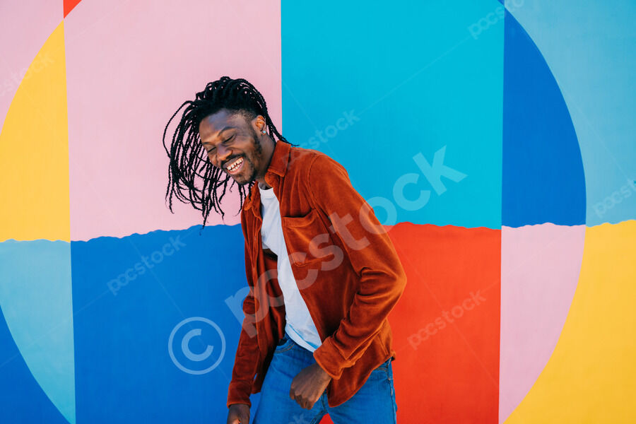 Black gay man embracing his caucasian boyfriend from behind against colorful wall outdoors