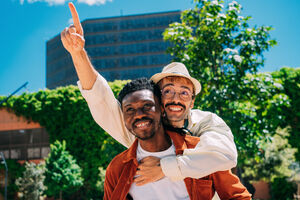 Black gay man giving piggyback ride to his caucasian boyfriend on city street on sunny day