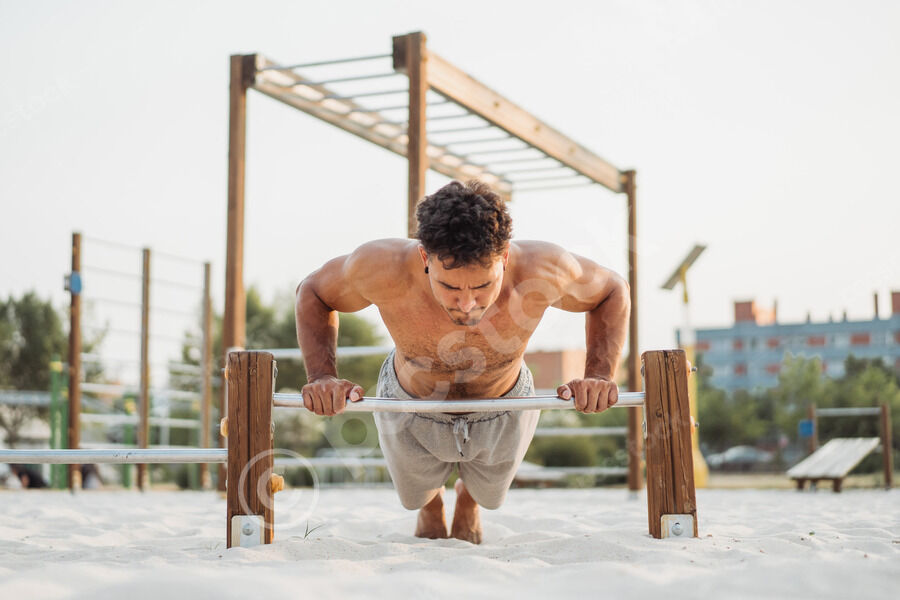 Hispanic male doing parallel bar push ups during workout on sandy beach during daytime