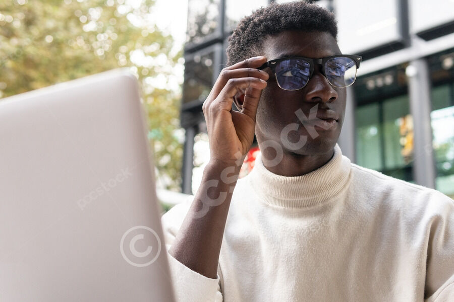 Serious Black male freelancer adjusting eyeglasses looking away while sitting at table with laptop in outdoor cafe