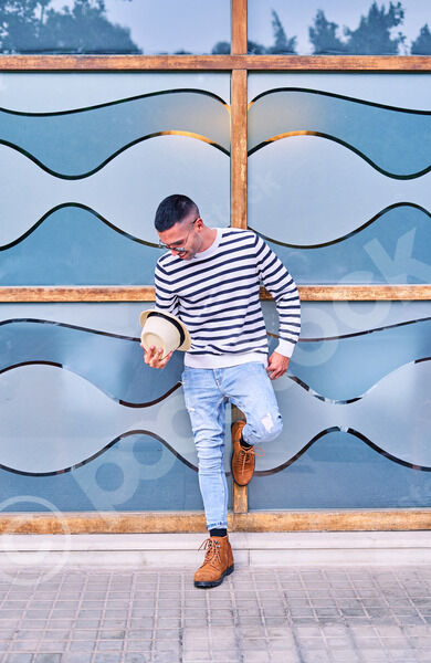 Hispanic man standing with crossed legs leaning on abstract wall on street