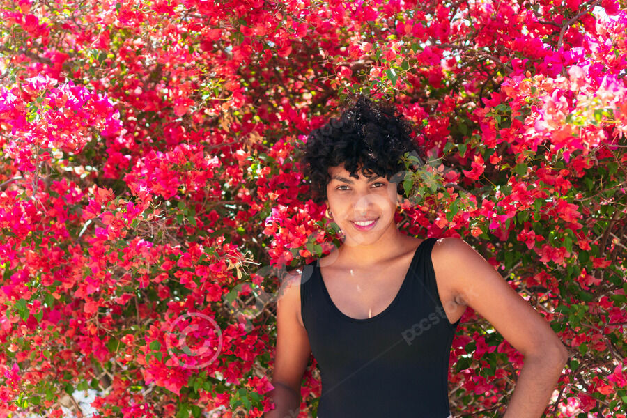 Black woman with curly hair sitting on a wall in the street and laughing happily